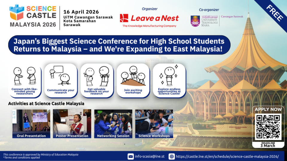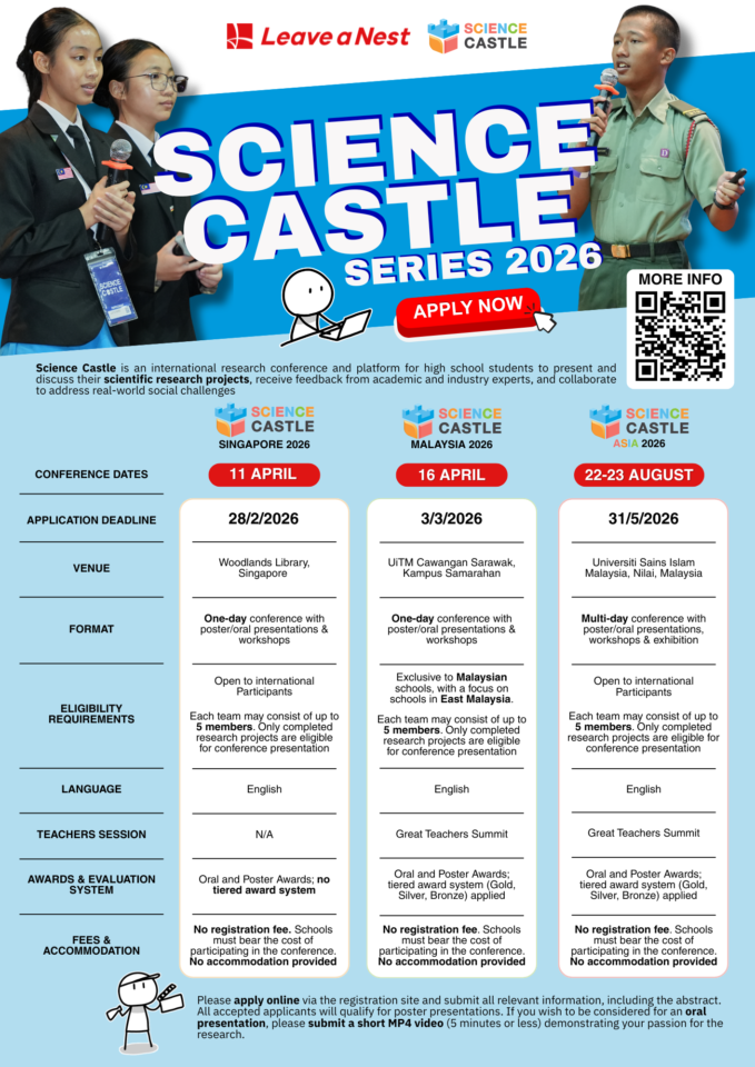 Cyberjaya, Malaysia — Leave a Nest Malaysia is excited to announce that applications are now open for Science Castle Malaysia 2026 and Science Castle Asia 2026, premier research platforms designed to empower high school students (aged ~13–18) to present scientific projects, receive expert feedback, and collaborate with peers regionally and internationally.